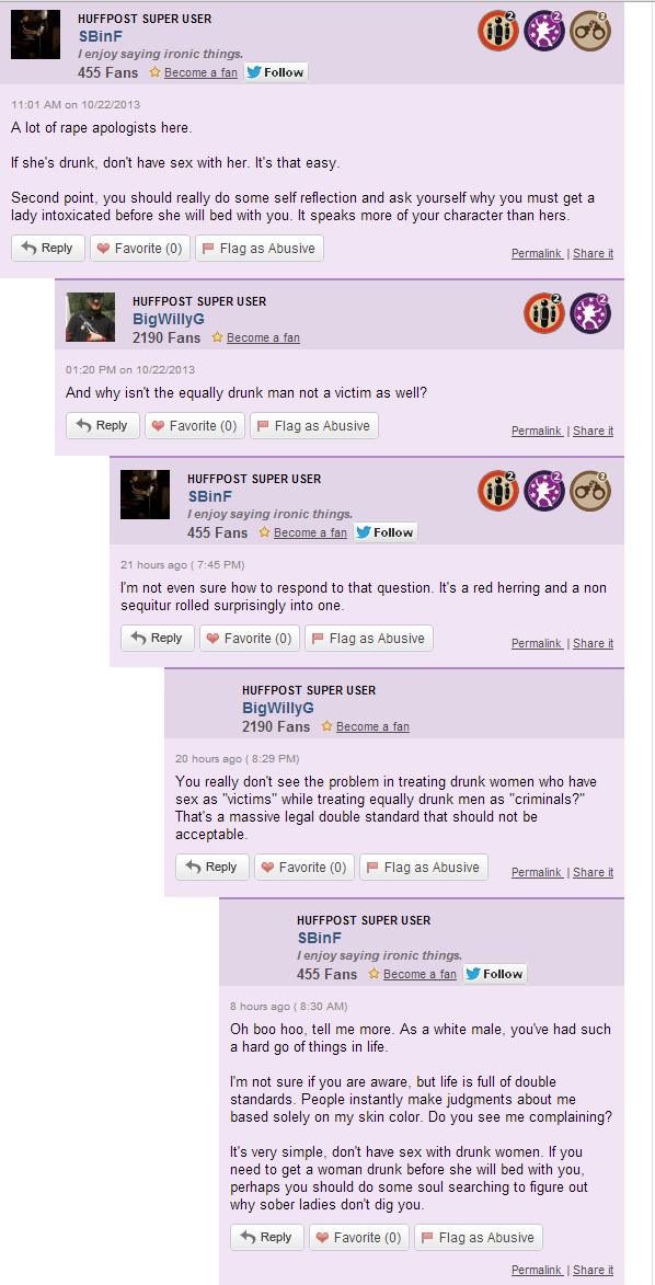 I’m not sure how race comes into this. Apparently she has never heard of Praise Martin-Oguike or Brian Banks. And trust me folks: as someone who reviews the publication at least every other day, that about summarizes the intellectual and moral caliber of your average HuffPo College commenter.